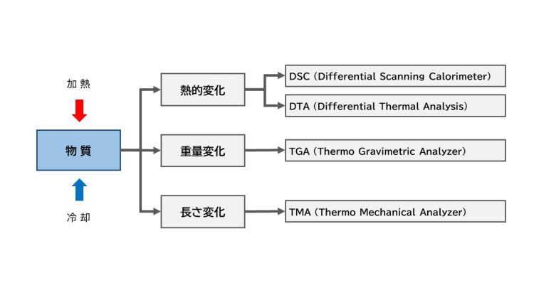 一般社団法人日本分析機器工業会では一般的に用いられる技法として、温度(基準物質との温度差)を検出する「示差熱分析(DTA)」、基準物質との熱流差を検出する「示差走査熱量測定(DSC)」、質量(重量変化)を検出する「熱重量測定(TG)」、寸法変化を検出する「熱機械分析(TMA)」、弾性率を検出する「動的粘弾性測定(DMA)」の5つに大別しています。